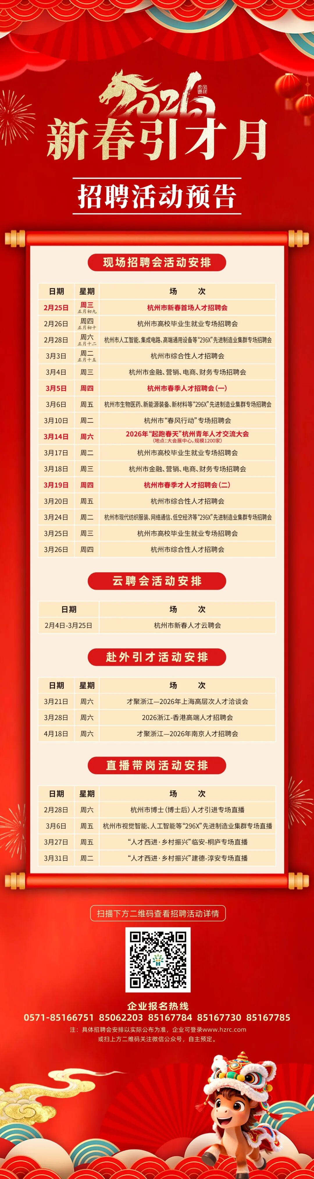 春节过后是人才流动高峰期。自2月25日至3月31日,杭州全面推出2026“新春引才月”活动,开展现场招聘会、云聘会、赴外引才、直播带岗活动。满足求职者、企业多样化需求。可扫描下方二维码查看招聘活动详情。