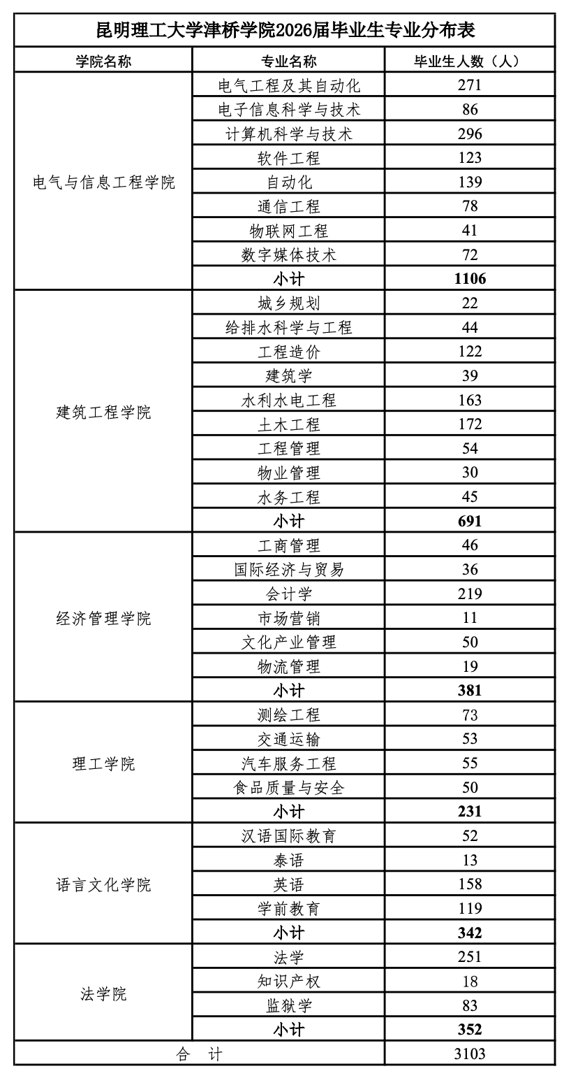 附件1:昆明理工大学津桥学院2026届毕业生专业分布表: